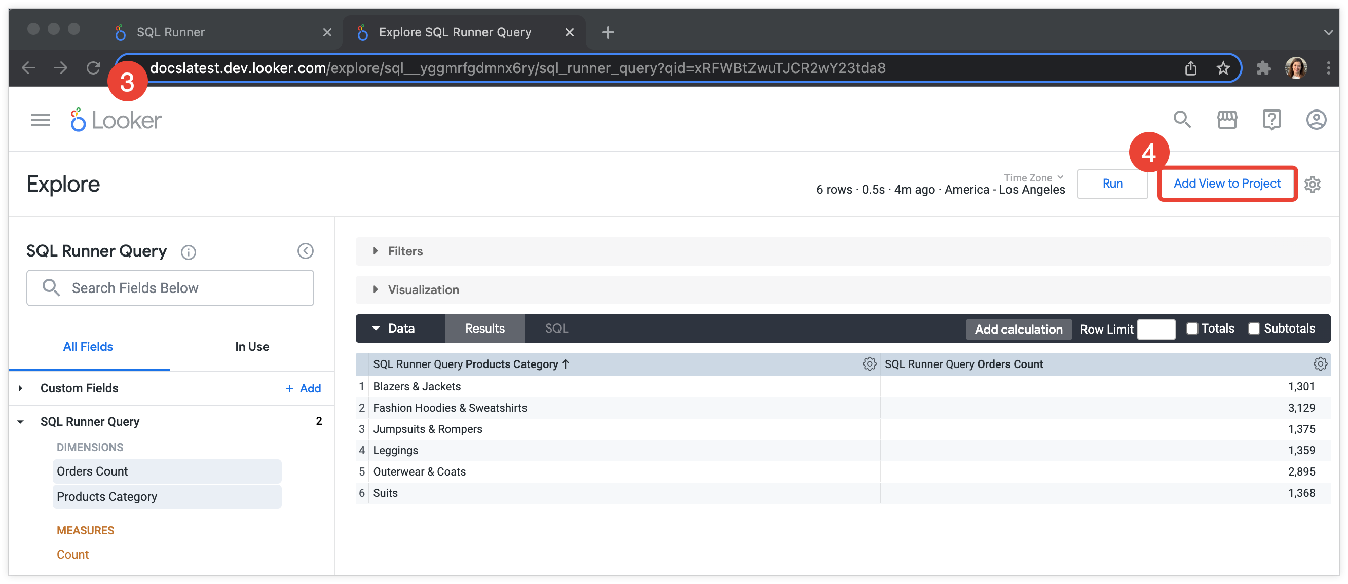 SQL Runner ti consente di aprire un'esplorazione da una query SQL. Viene creata un'esplorazione temporanea dalla query scritta in SQL Runner. In questo modo puoi testare ciò che viene restituito dalla query e visualizzare i risultati. Questo può essere utilizzato per qualsiasi query, ma è particolarmente utile per testare le query che prevedi di utilizzare per le tabelle derivate.