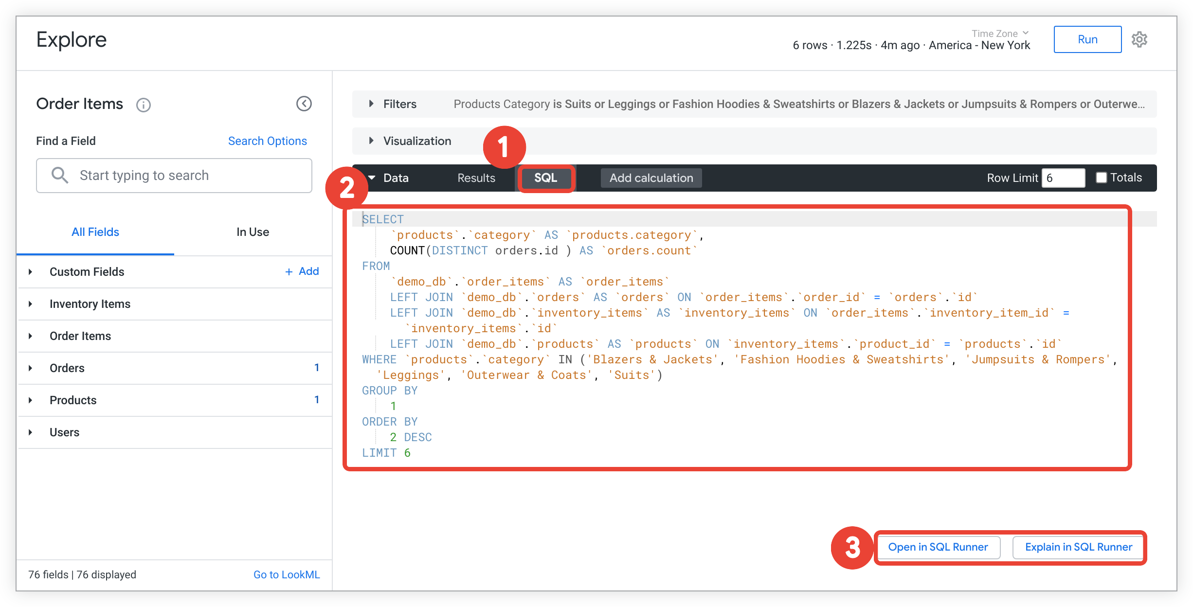 Per eseguire una query sul modello LookML in SQL Runner: