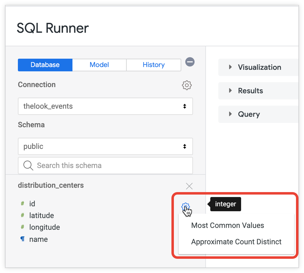 SQL Runner에는 데이터를 이해하는 데 도움이 되는 몇 가지 사전 작성된 쿼리가 있습니다. 이러한 쿼리를 사용하려면 테이블 또는 테이블 열 이름 옆에 나타나는 톱니바퀴를 클릭하고 실행할 쿼리를 선택합니다. Looker가 SQL 쿼리 섹션에서 SQL을 자동으로 생성하고 쿼리가 실행됩니다.