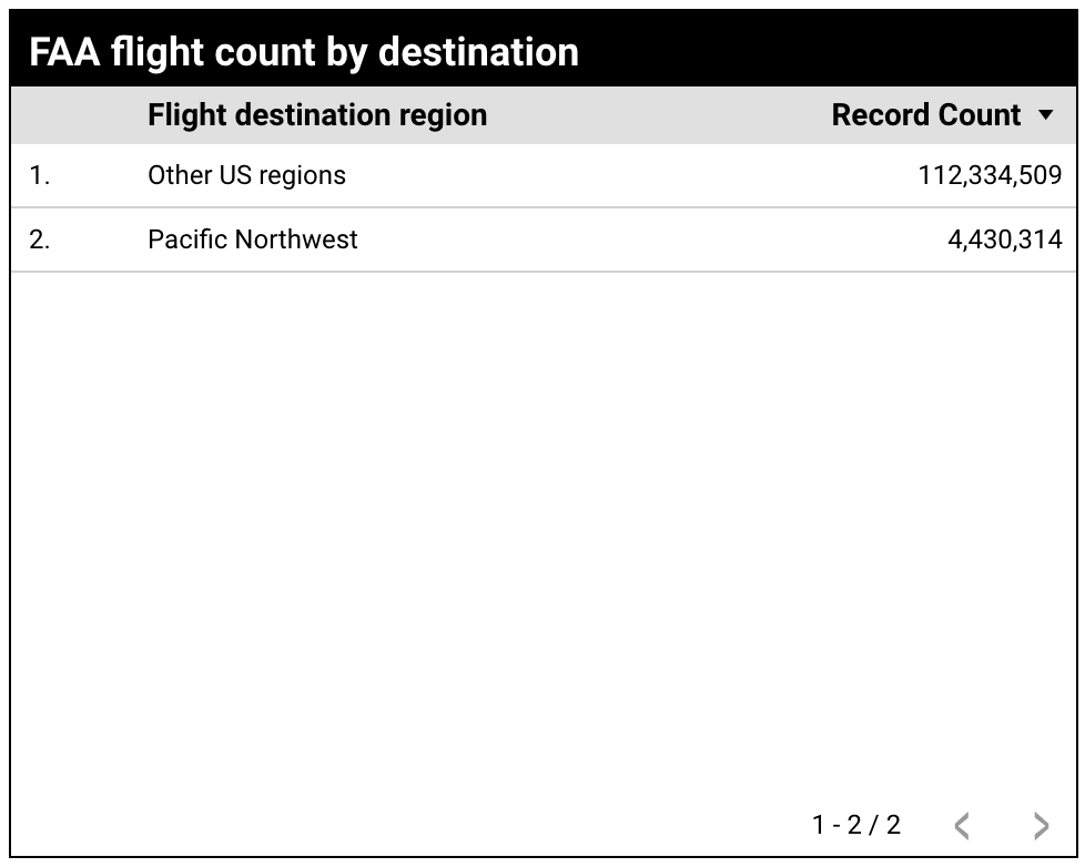 舉例來說,名為「FAA flight count by destination」(依目的地劃分的 FAA 航班數) 的表格圖表會顯示「Record Count」(記錄數) 指標,並依代表航班目的地的「DestState」(目的地州別) 維度分組。