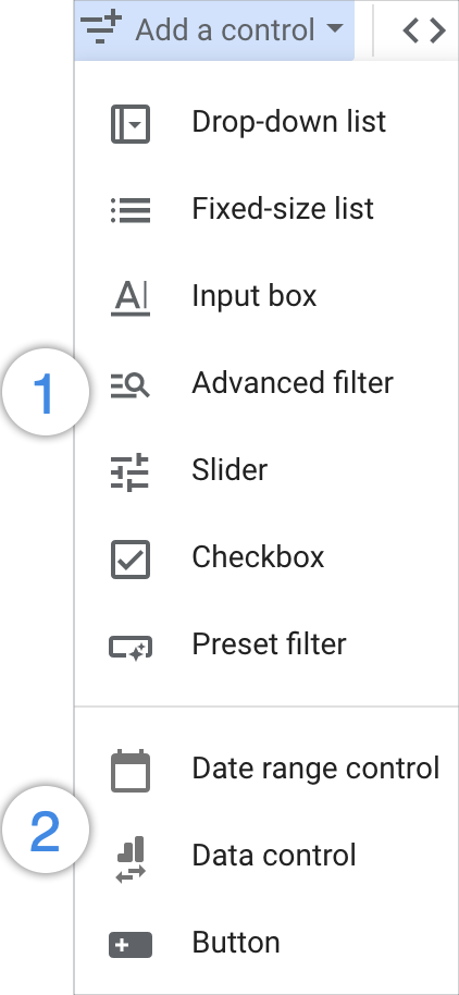 - Los controles permiten recoger entradas de usuarios y utilizarlas en campos calculados y en conectores que admiten parámetros, como los conectores comunitarios o de BigQuery.