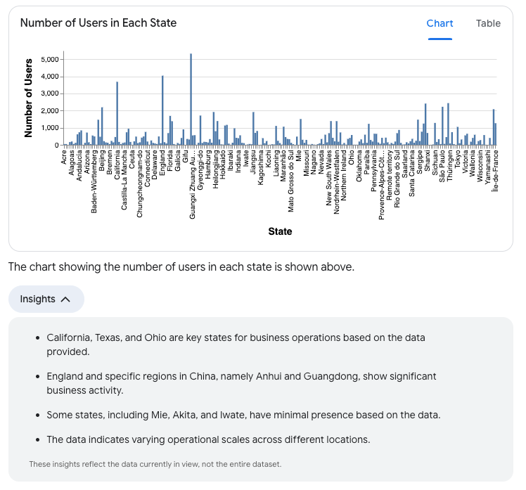 The following is an example of some insights that might be returned by the prompt "How many users are in each state?":