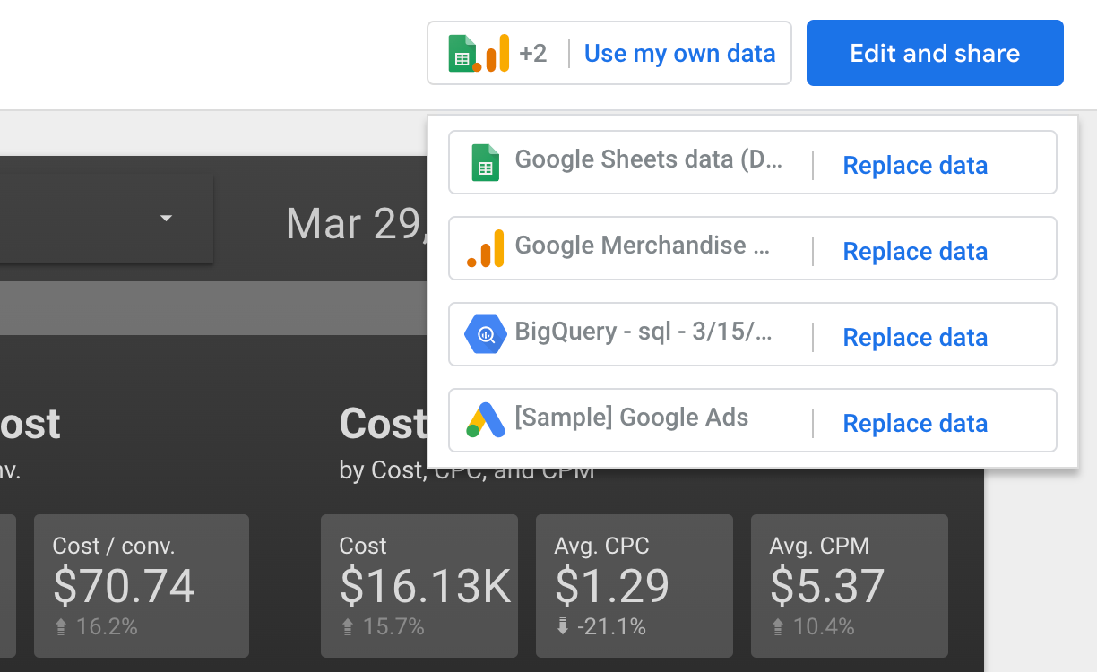 - En haut à droite, cliquez sur Utiliser mes propres données, puis sur Remplacer les données.