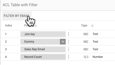 Finally, blend the data table with the ACL table. Since we want to effectively add the sales rep email as a column to the data table, we will start from the data table and then left-join the ACL table.