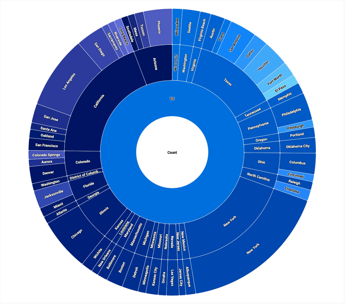Misalnya, Anda dapat membuat diagram sunburst yang menampilkan ukuran Jumlah Pesanan, yang dikelompokkan menurut dimensi Negara Pengguna, Negara Bagian Pengguna, dan Kota Pengguna. Ukuran setiap irisan cincin sesuai dengan Jumlah Pesanan .