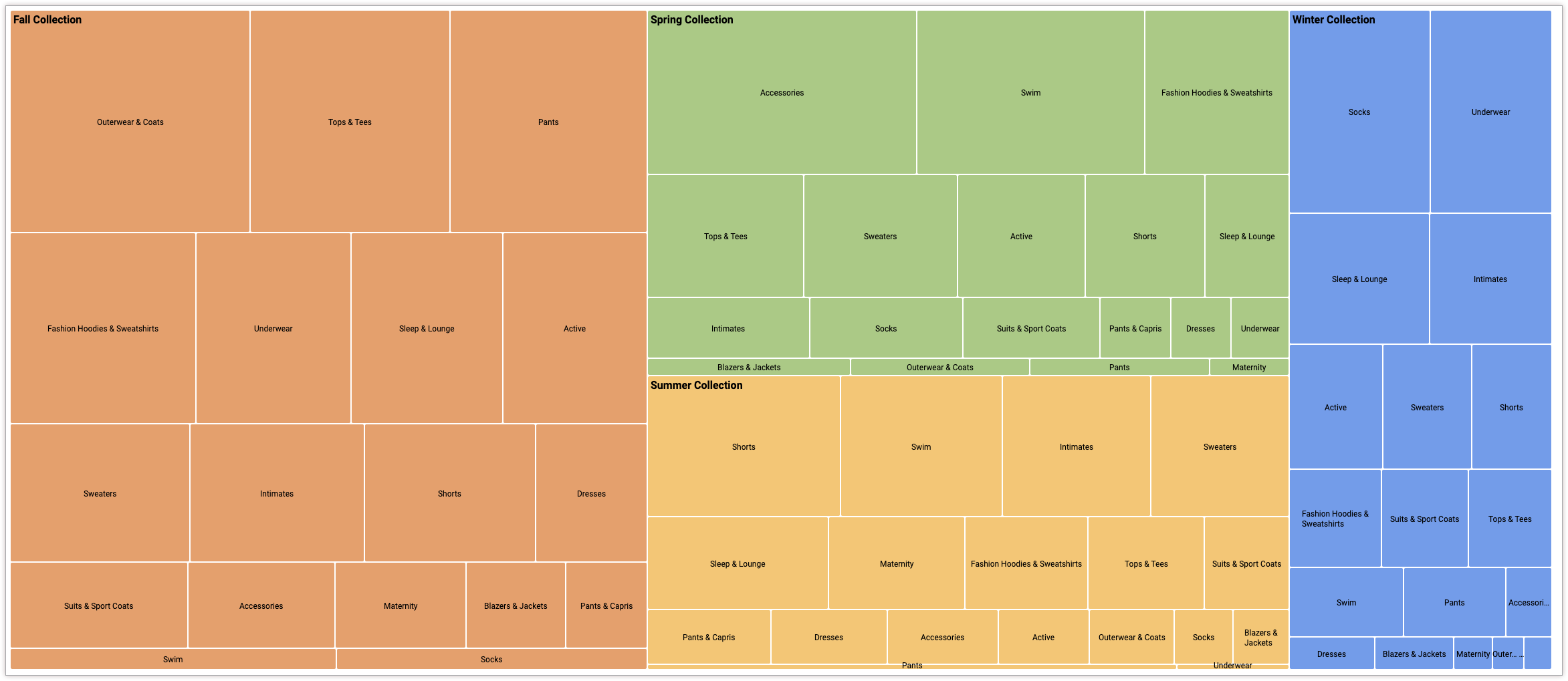 Sie können beispielsweise ein Baumdiagramm erstellen, in dem die Anzahl der Bestellpositionen für verschiedene Kategorien dargestellt und nach Saisonale Kollektion aufgeschlüsselt wird. Jede Jahreszeit wird durch ein farbcodiertes Rechteck dargestellt, das kleinere Rechtecke für die Kategorie enthält. Die Größe der einzelnen Rechtecke entspricht der Anzahl der Positionen .