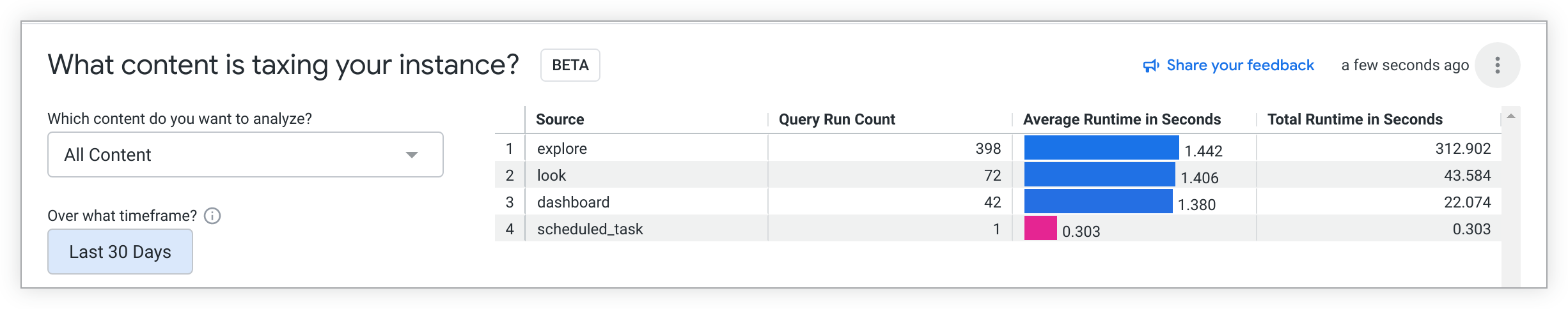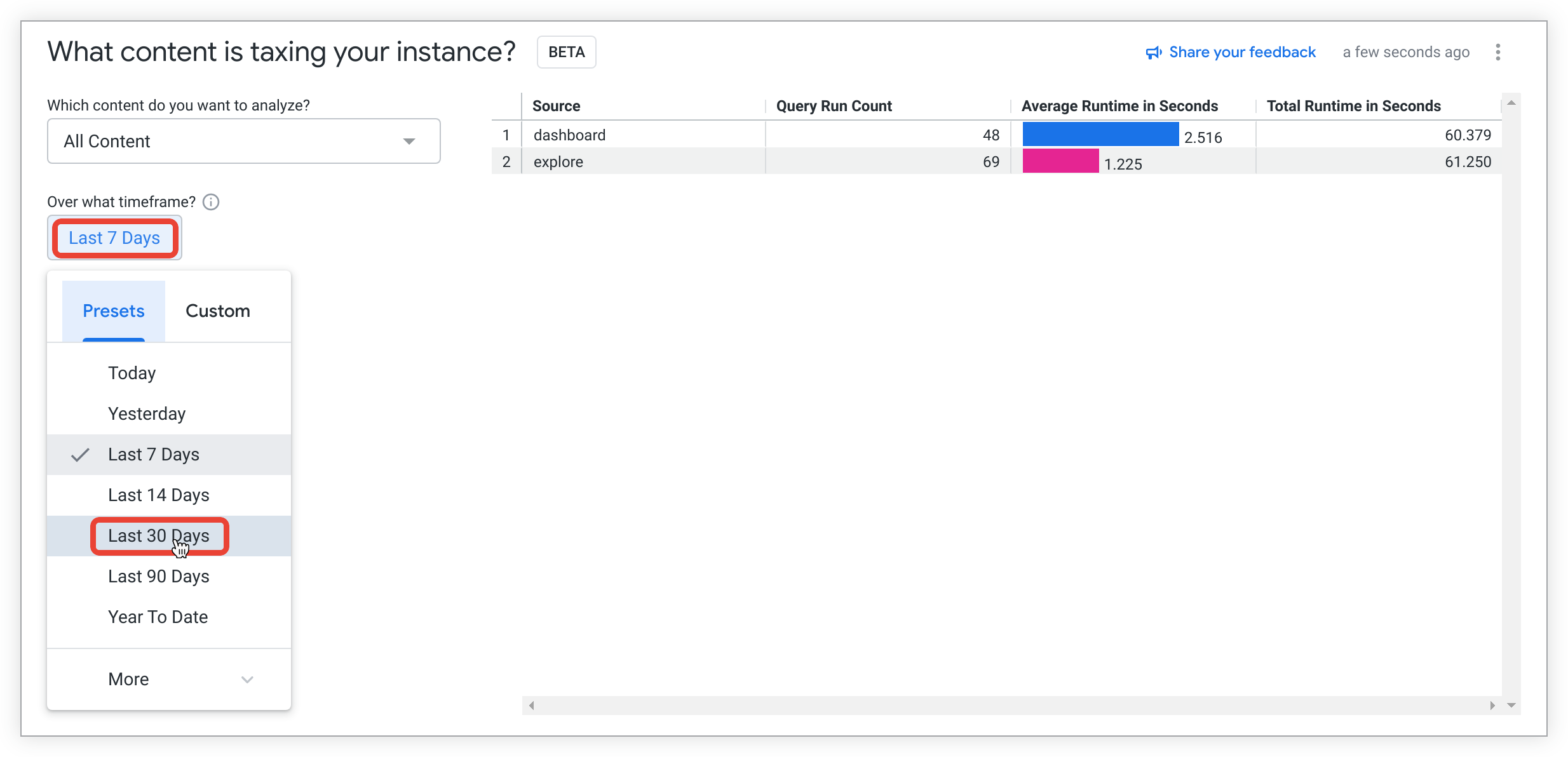 たとえば、[インスタンスに課金されているコンテンツ] 分析を選択して、Looker インスタンスで頻繁に使用されるコンテンツを特定できます。ガイド付き分析が読み込まれたら、[Over what timeframe?] のデフォルトの期間の値を [過去 30 日間] に変更できます。