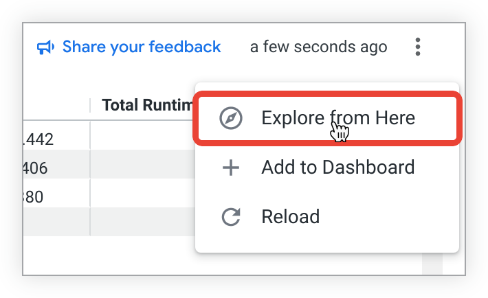 To save a guided analysis as a Look, select the Explore from Here option from the three-dot Options menu: