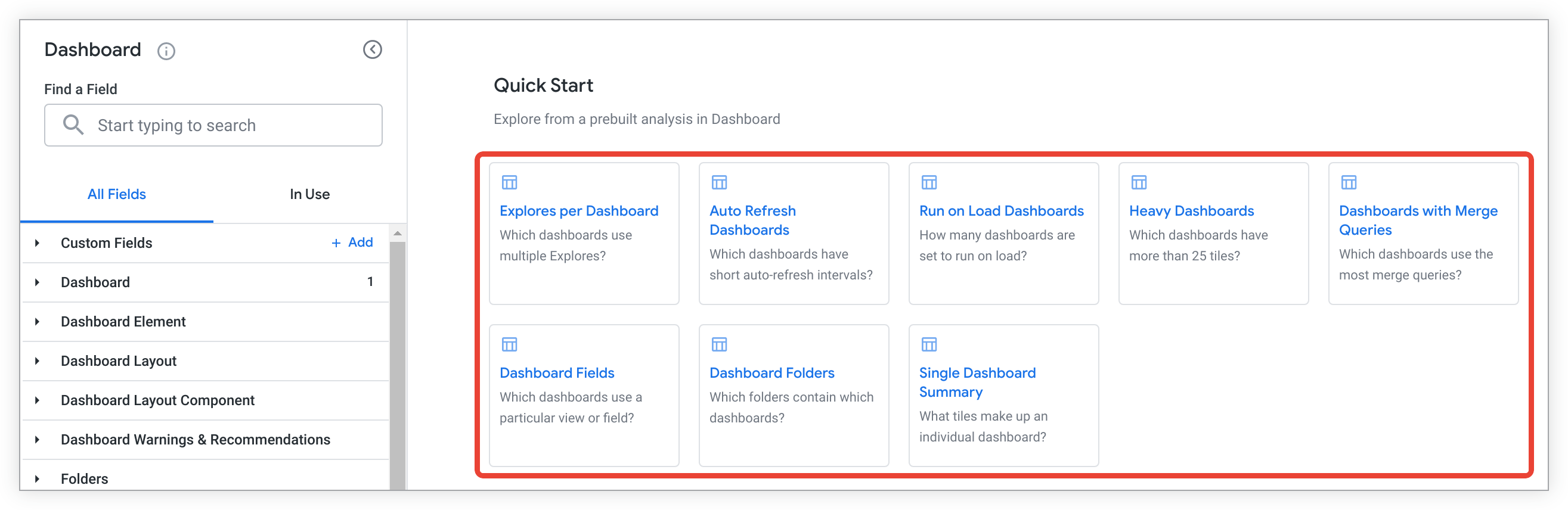 | Dashboard | Details about all dashboards and dashboard elements. Includes information about Looks, queries, roles, users, and folders that are associated with dashboards. | 12 hours | |