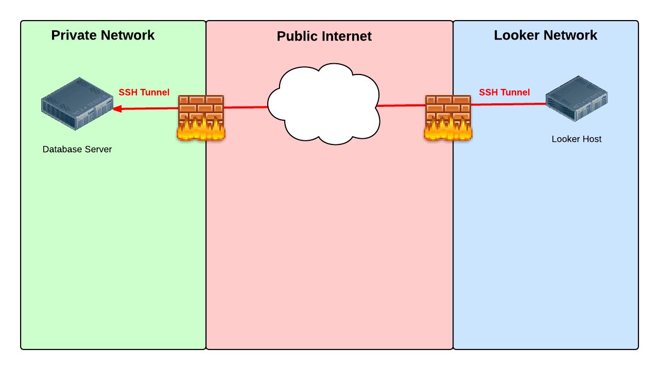 Quando utilizzi un server di tunnel, Looker si connette al server di database tramite un server di tunnel separato su una rete con limitazioni. La terminazione del tunnel su un server separato offre la possibilità di mantenere il server di database inaccessibile da internet. Se il server del tunnel viene compromesso, può essere rimosso in un singolo passaggio dal server di database. È consigliabile rimuovere tutto il software e tutti gli utenti non essenziali dal server del tunnel e monitorarlo attentamente utilizzando ad esempio un IDS.