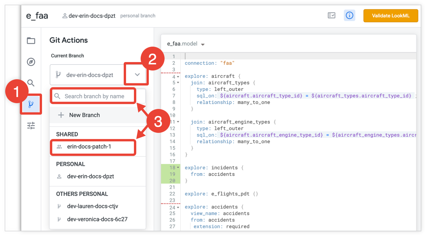 No entanto, se a ramificação tiver sido criada por outro programador do Looker ou se outros programadores tiverem feito o check-out da ramificação, esses programadores continuam a ter a respetiva versão local da ramificação. Se um programador do Looker confirmar alterações na respetiva versão local do ramo e as enviar para produção, volta a ver uma versão remota do ramo. Isto pode ser útil se quiser restaurar a ramificação. Caso contrário, quando elimina uma ramificação, todos os outros programadores do Looker devem eliminar a mesma ramificação para garantir que não pode ser acidentalmente reposta por alguém que a envie para o repositório remoto.