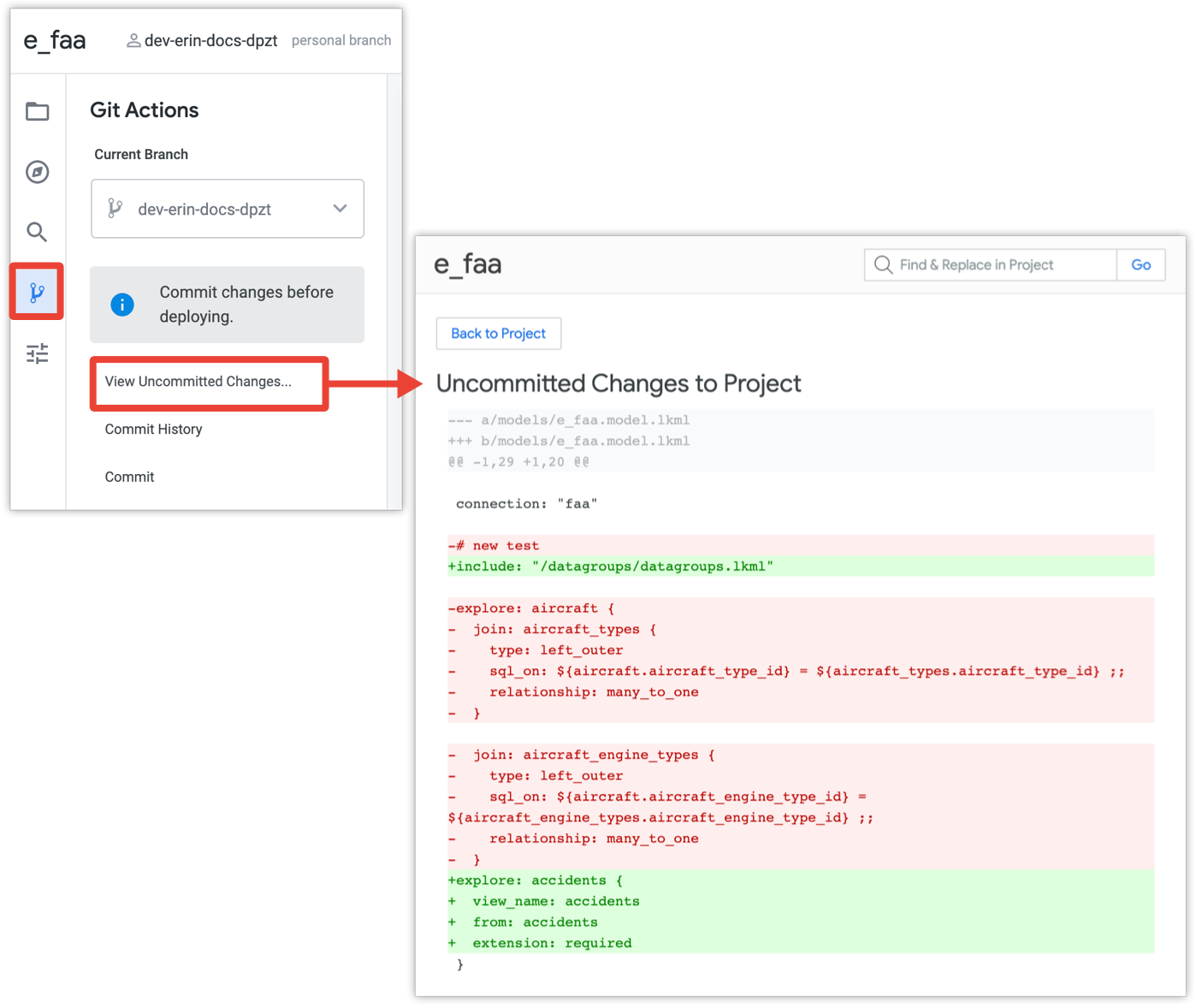 deploy, o IDE do Looker pede-lhe que combine as suas alterações com o ramo de produção e implemente as alterações na versão de produção da sua instância do Looker.