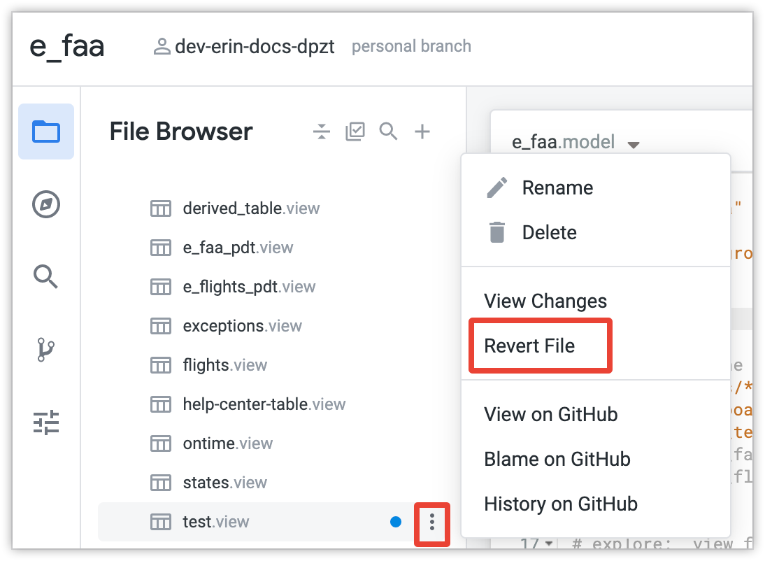 • When you delete a file, the file is no longer displayed in the IDE file browser. If you want to revert the deletion of a file, use the Revert to... option from the Git Actions panel.