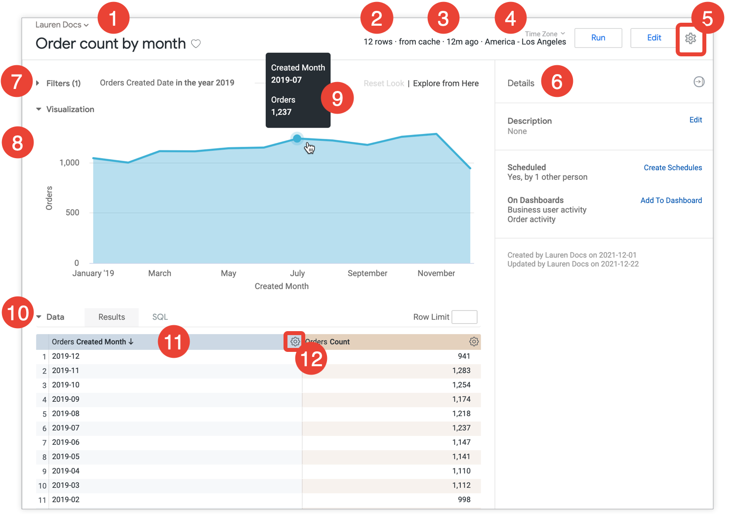 - Informazioni sul numero di righe nel Look, sulla durata dell'esecuzione della query e sull'età dei dati.