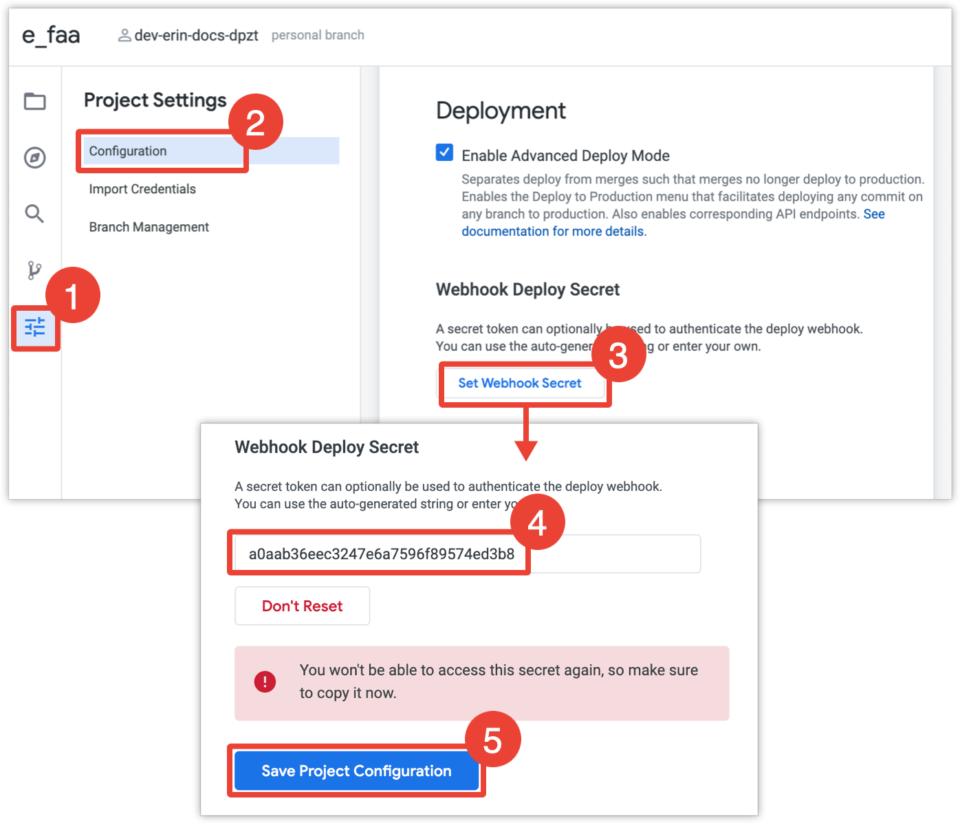 - To permanently remove the webhook deploy secret from your project, click Save Project Configuration.