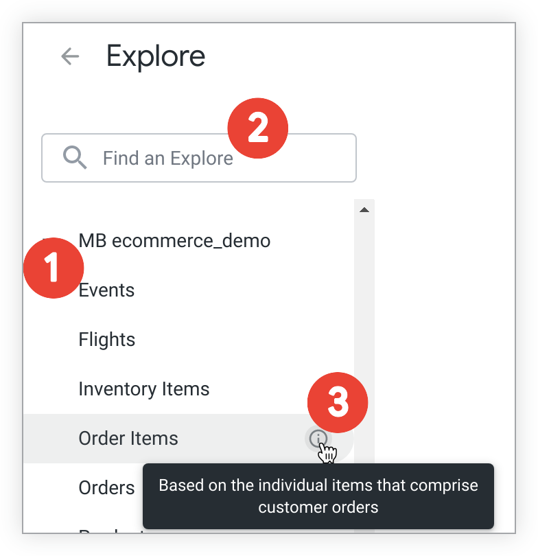 - The Explore panel in the left navigation panel is organized by model names. Under each model name is a list of available Explores that are defined in that model.
