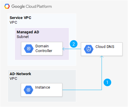 虚拟机尝试解析 DNS 名称时,不会直接查询网域控制器,而是将 DNS 查询发送到元数据服务器,该元数据服务器是为 Compute Engine 虚拟机配置的默认 DNS 服务器。然后,元数据服务器将查询转发到由托管式 Microsoft AD 创建的 Cloud DNS 专用 DNS 转发地区。此转发地区再将查询转发到适当的网域控制器。