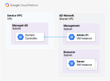 Você criará essa instância de VM em um projeto dedicado ao gerenciamento do Active Directory e a conectará à sub-rede de gerenciamento da VPC compartilhada.
