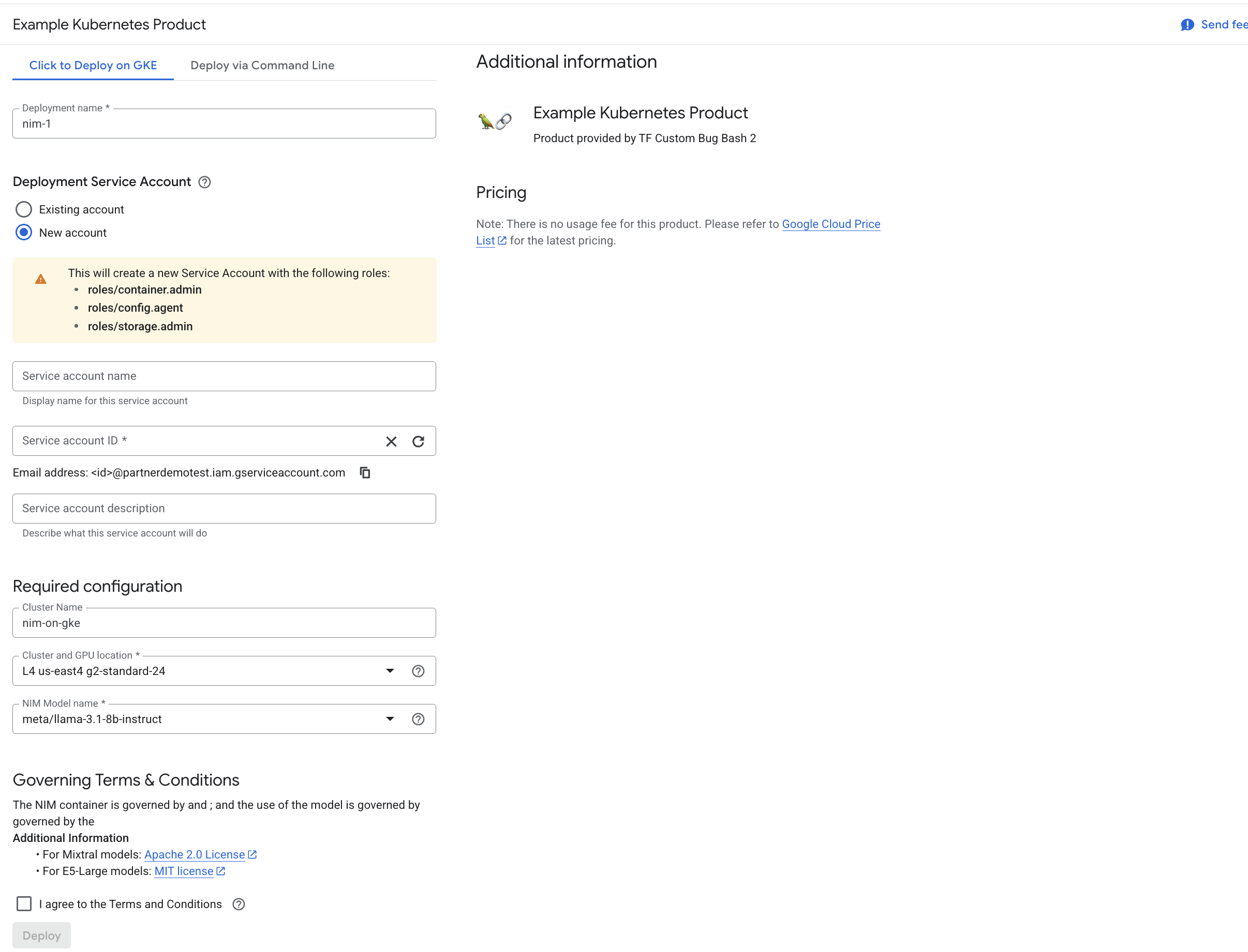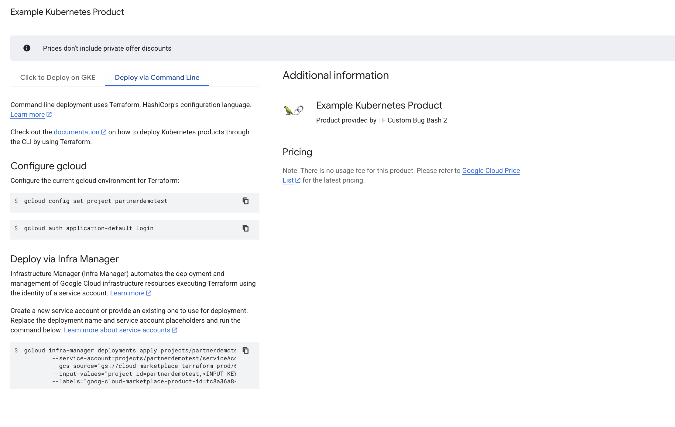 If you offer Terraform Kubernetes apps through Google Cloud Marketplace which are based on auto-generated standard packages, your customers see the following screen layouts when they get your product and deploy it.