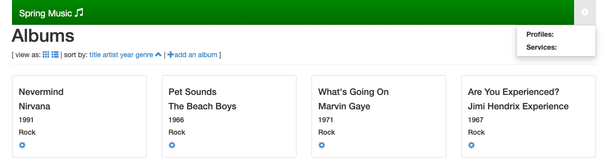 The deployed App includes a UI element showing which (if any) Spring profile is being used. No profile is being used here, indicating an in-memory database is in use.