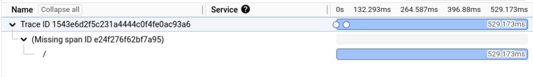 出力の HTTP リクエストのトレースデータを収集するように合成モニターを構成します。次のスクリーンショットと同様に、トレースデータにはスパンが 1 つだけ表示されます。