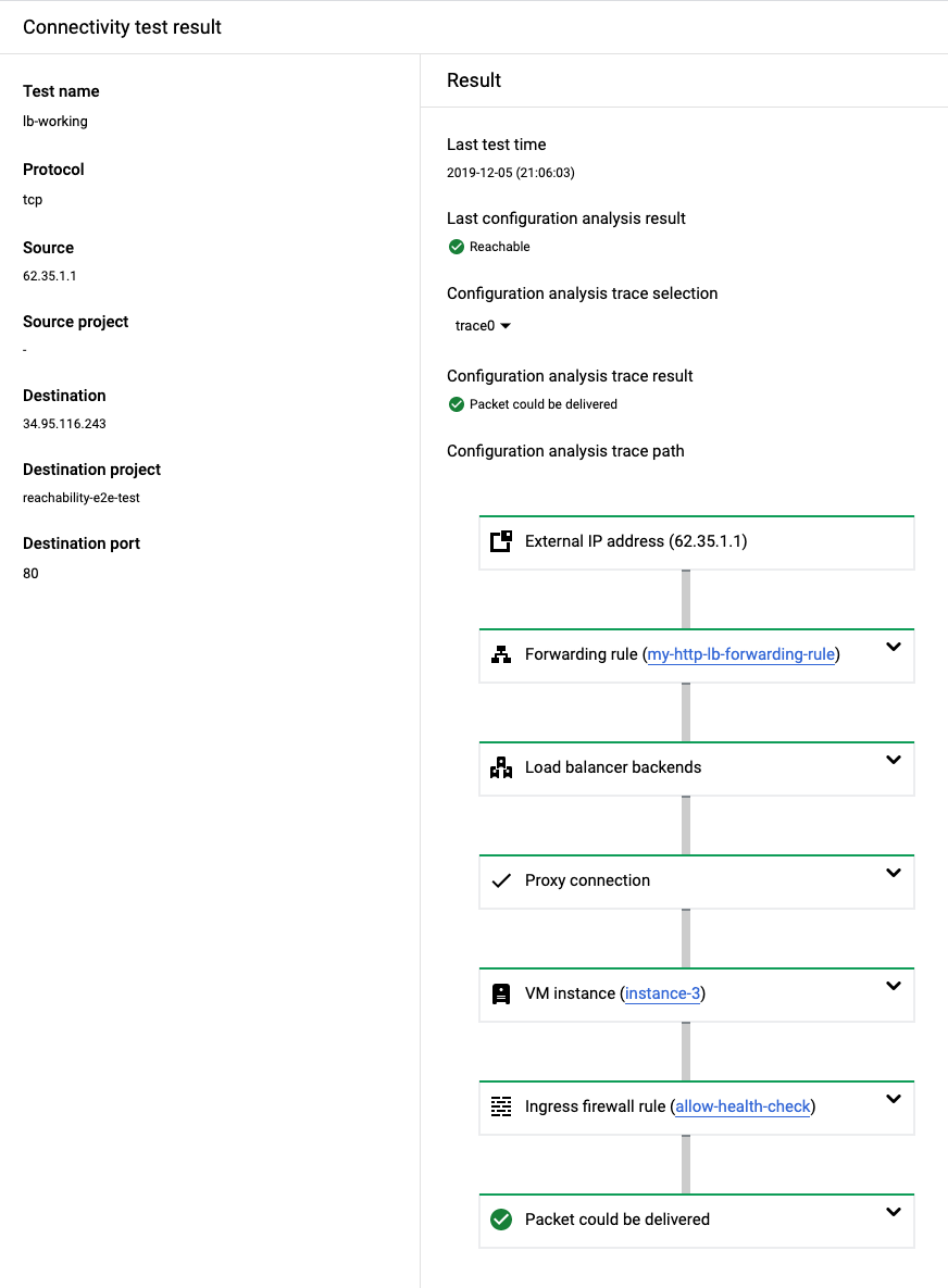 Connectivity Tests configuration analysis supports tracing simulated packets to all types of Google Cloud load balancers. The trace path for an external Application Load Balancer also applies to external proxy Network Load Balancers. For more information, see the Cloud Load Balancing overview.