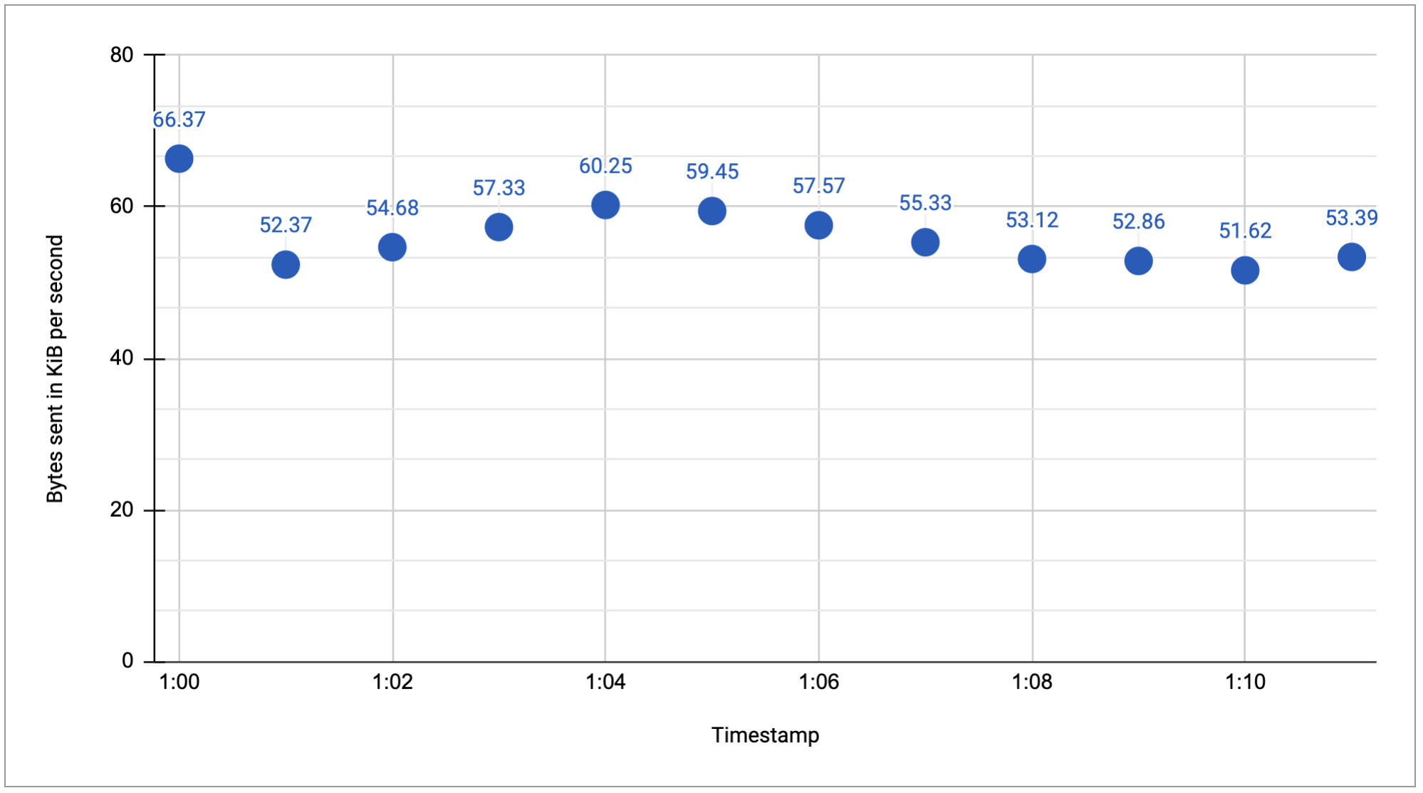 Para presentar el muestreo y la agregación de los ejemplos de esta página, se utiliza un número reducido de series temporales hipotéticas. Por ejemplo, en el siguiente diagrama se muestran unos minutos de datos sin procesar del tipo de métrica bytes por segundo: