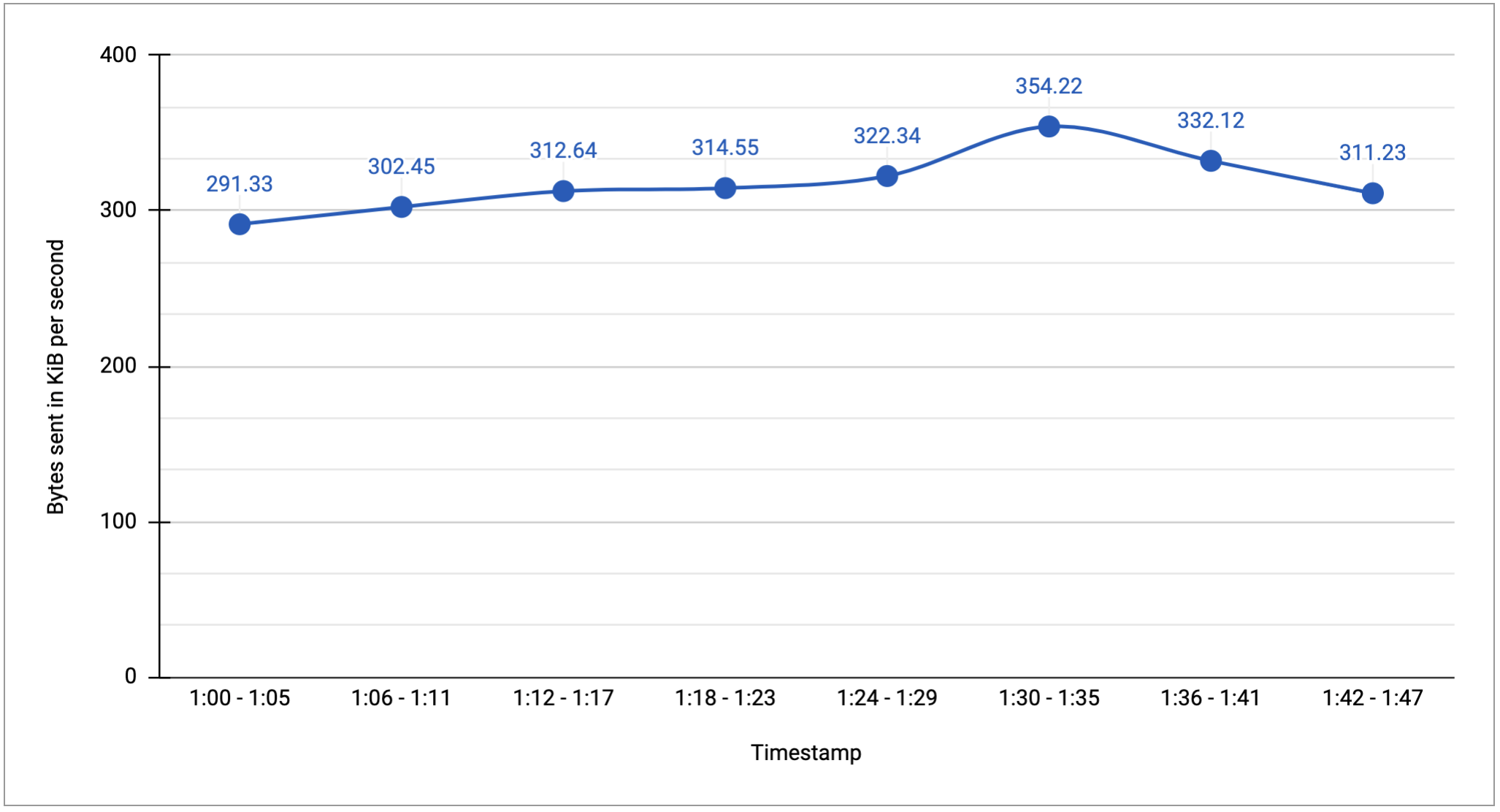 サンプリングと集計を導入するために、このページの例では少数の仮の時系列を使用します。たとえば、次の図は、指標タイプが 1 秒あたりのバイト数の数分ぶんの元データを示しています。