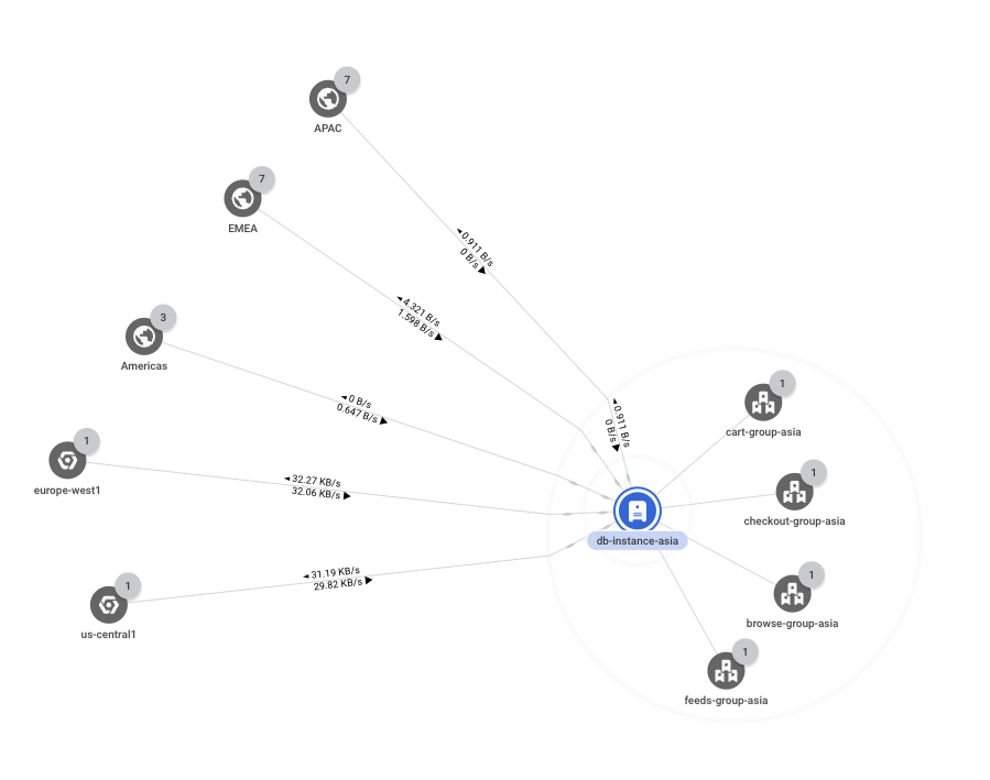 db-group-asiaグループを展開します。このシナリオのベース エンティティは、データベース サーバーとして機能する仮想マシン(VM)インスタンス(db-instance-asia)です。このインスタンスは他のリージョンと通信してデータを複製しています。これは予想どおりであり、これ以上調べる必要はありません。̦1この図は参考用です。この図のデータはユースケースを反映していません。