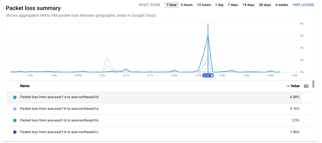 No exemplo seguinte, pode ver que o tráfego Google Cloud sofreu perda de pacotes recentemente. Se passar o ponteiro sobre o gráfico, pode ver que a perda máxima ocorreu entre asia-east1-a e asia-northeast3-b às 14:26.