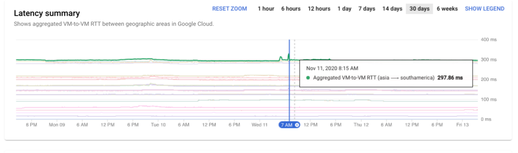 The chart displays the data for Monday the 9th through Friday the 13th. You can pinpoint a modest spike in latency on November 11 at 8:15 AM.