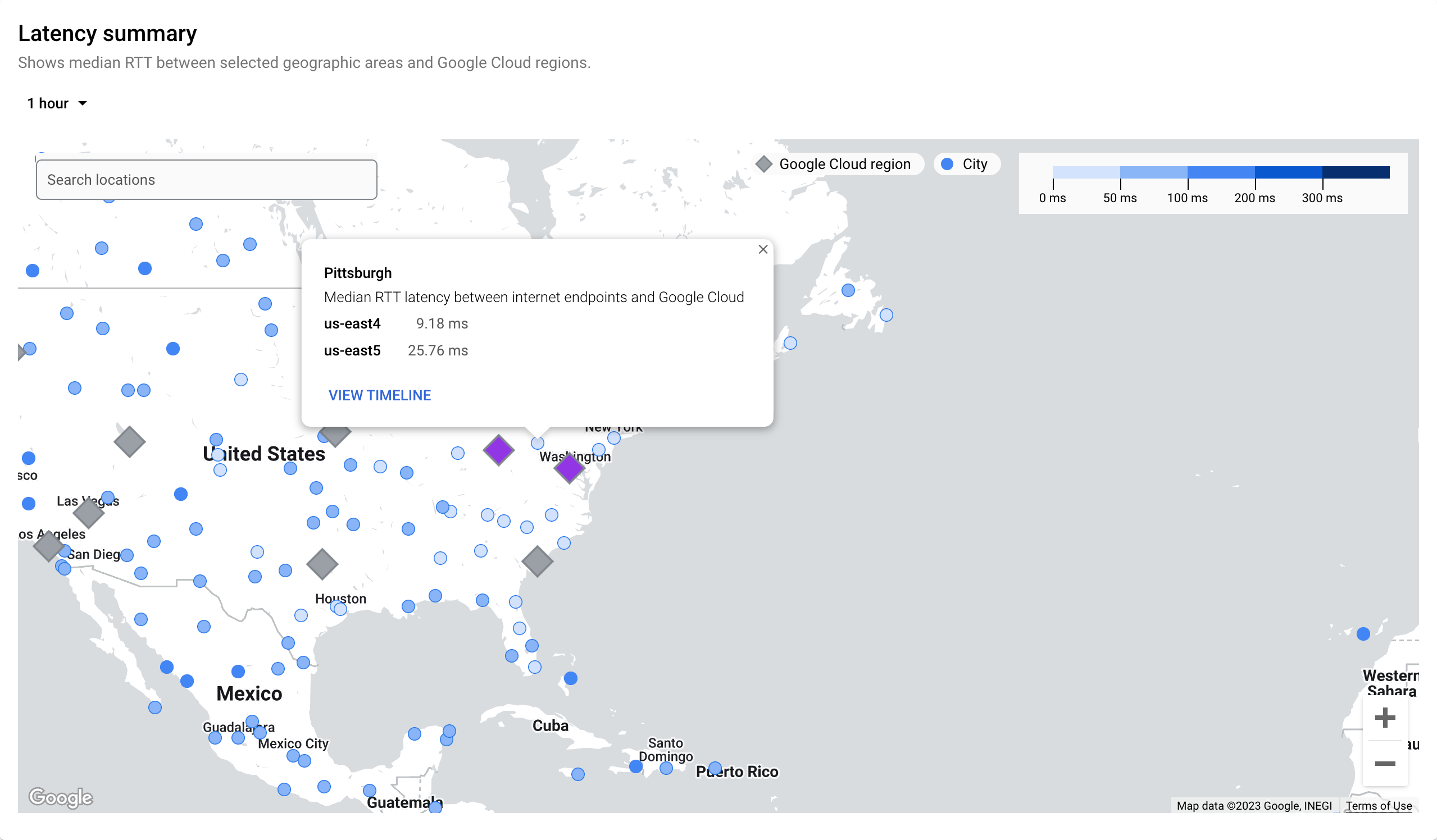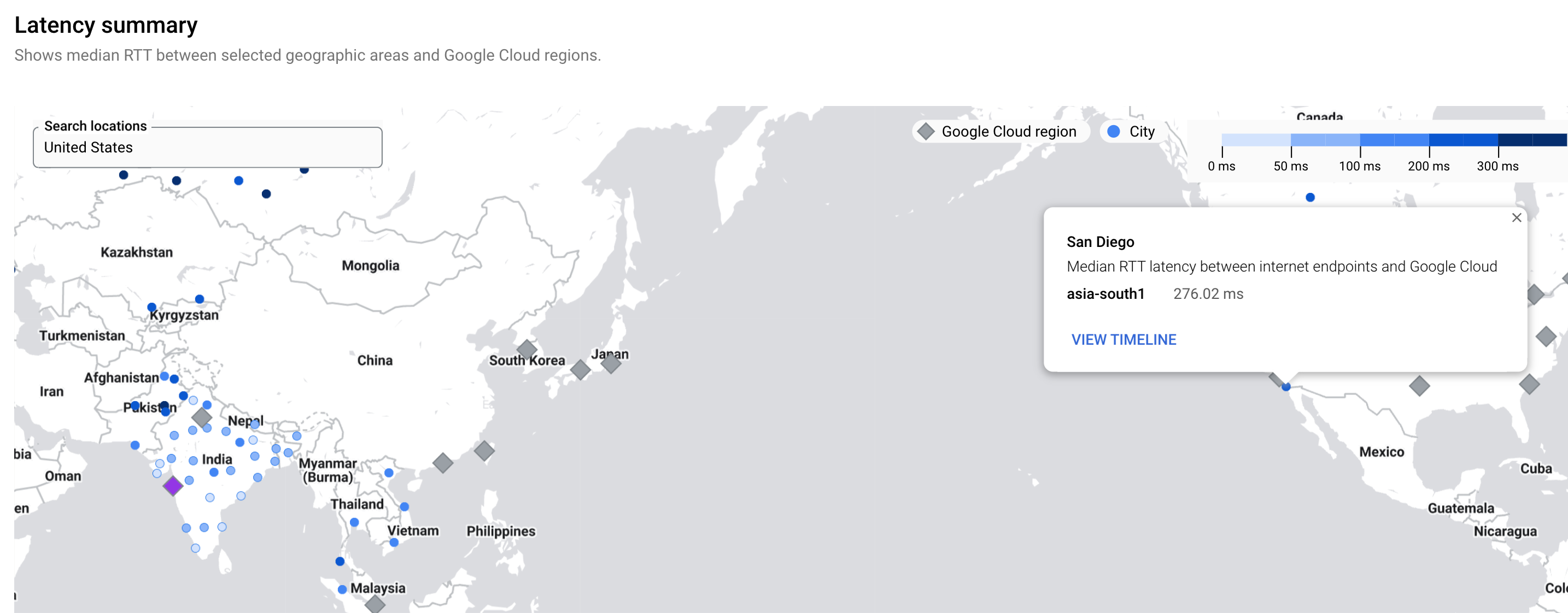 - 如需查看特定区域的延迟时间详情,请选择该区域,将指针悬停在城市上,然后点击查看时间轴。时间轴中的线表示该流量路径的延迟时间。流量路径是所选 Google Cloud 区域和互联网位置到达目的地采用的路由。