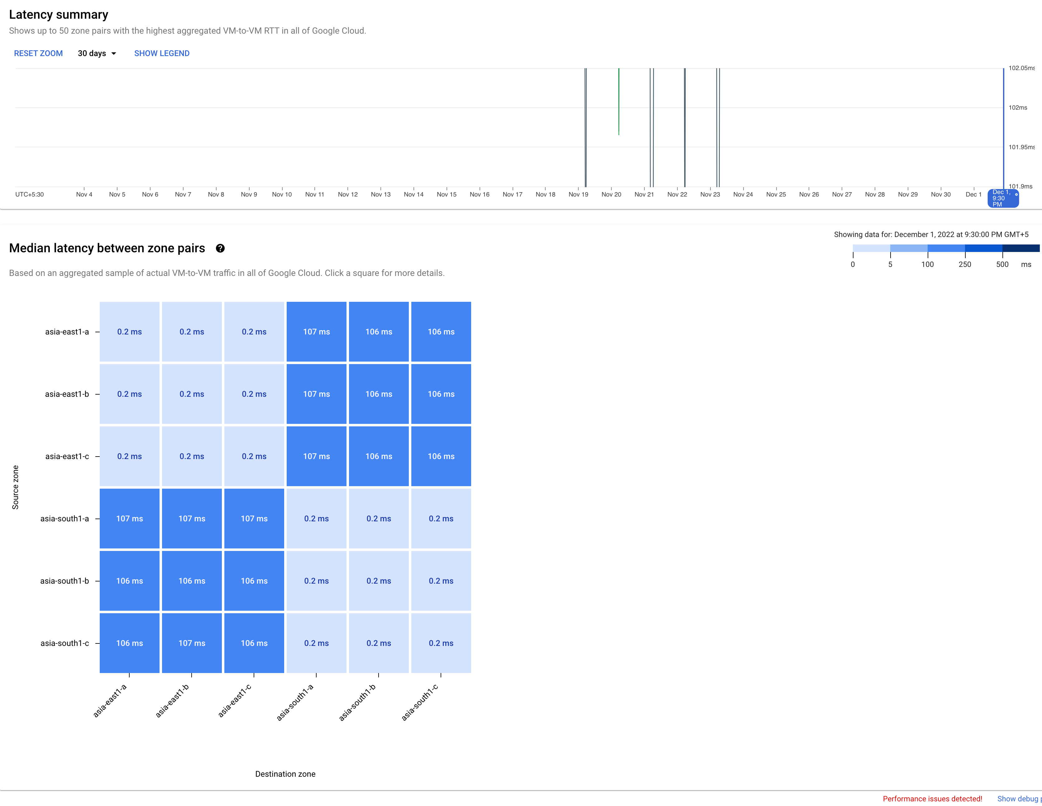 אפשר להשתמש בתרשים של סדרת זמנים כדי להציג נתונים היסטוריים של זוגות אזורים נבחרים. בדוגמה הזו אפשר לראות את הריבוע במפת החום של צמד האזורים asia-east1-a ו-asia-northeast3-a, ואת בורר הזמן שהוגדר ל-30 ימים.