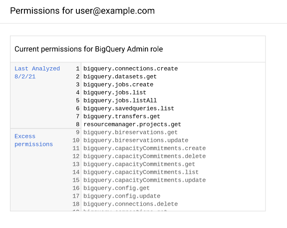 分析情報が推奨事項に関連付けられていない場合、パネルにはロールのすべての権限のリストが表示されます。プリンシパルが使用している権限がリストの先頭に表示され、その後に過剰な権限が表示されます。