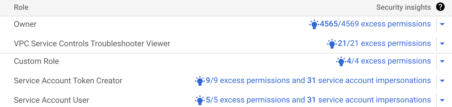 Per ogni ruolo concesso a un principal, questa colonna mostra eventuali approfondimenti relativi alla sicurezza. Questi insight evidenziano i pattern di accesso alle risorse da parte delle tue entità. Ad esempio, alcuni approfondimenti evidenziano le autorizzazioni in eccesso o le autorizzazioni di cui un'entità non ha bisogno. Altri approfondimenti mettono in evidenza i service account con funzionalità di movimento laterale: