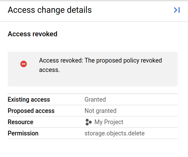 Jika tidak ada perubahan akses antara kebijakan izin yang ada dan kebijakan izin yang disimulasikan, konsol Google Cloud tidak akan menampilkan perubahan akses apa pun.