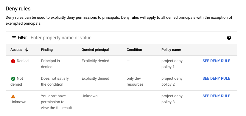 • denyPolicyExplanation: A summary of whether the relevant deny policies deny the principal the permission, followed by a list of resources with deny policies. For each resource, the response lists all deny policies attached to the resource.