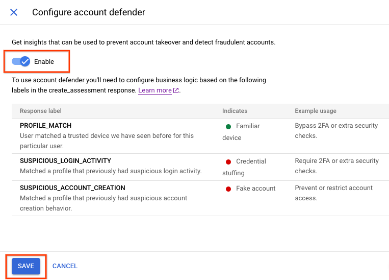 After you configure your web pages for reCAPTCHA Account defense, you can enable reCAPTCHA Account defense.