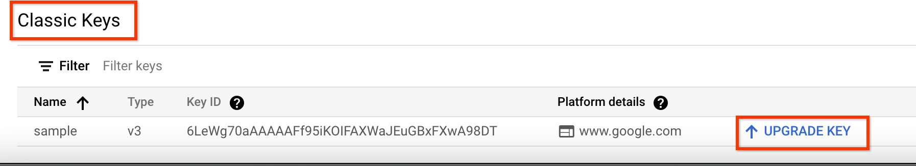 En la sección Claves clásicas, identifica la clave que quieras migrar y haz clic en Actualizar clave.