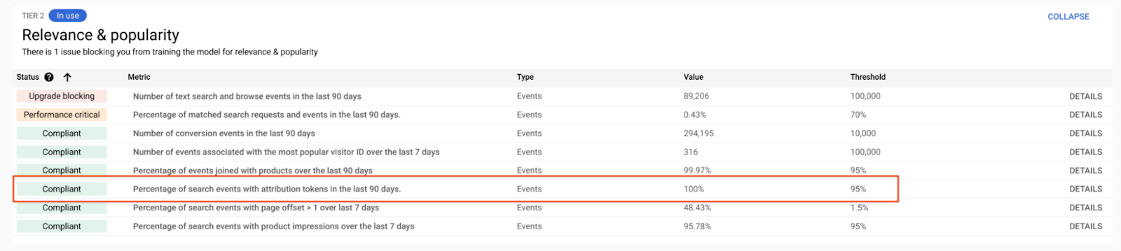 수익 최적화 모델인 Tier 3의 데이터 품질은 일반적으로 충분한 기여 분석 이벤트 없이 학습되지 않습니다. Tier 3 또는 Tier 4의 결과를 제공하지 않는 한 상거래를 위한 Vertex AI Search를 프로덕션에 배포하지 않는 것이 좋습니다. 자세한 내용은 데이터 품질 섹션에서 성능 등급을 잠금 해제하는 방법을 참고하고 이 문서의 데이터 품질 페이지를 참고하세요.