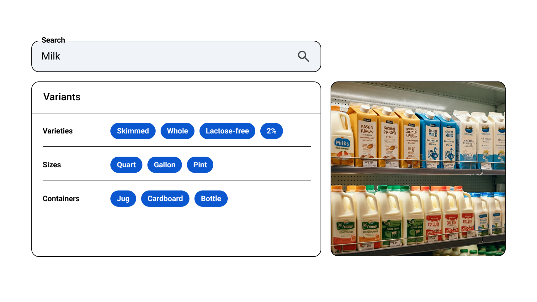 商品詳細ページにオプション、サイズ、色の選択ツールが表示されている場合、通常、これらのオプションはバリエーションとして商品カタログにアップロードされます。サイズや色などの属性が異なる同じ種類の商品を、1 つの検索結果として表示するか、別々の検索結果として表示するかを検討します。たとえば、書籍の場合、同じ書籍のハードカバー SKU とソフトカバー SKU を個別の検索結果として表示するか(SKU = プライマリ)、1 つとして表示するか(SKU = バリエーション、SKU のグループ = プライマリ)を決定します。