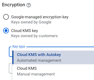 - Wählen Sie im Menü Schlüsseltyp die Option Cloud KMS mit Autokey aus.
