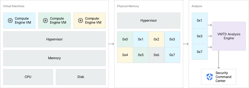 VM Threat Detection은 모든 Compute Engine VM을 만들고 관리하는 보안 플랫폼인 Google Cloud하이퍼바이저에 내장되어 있습니다.