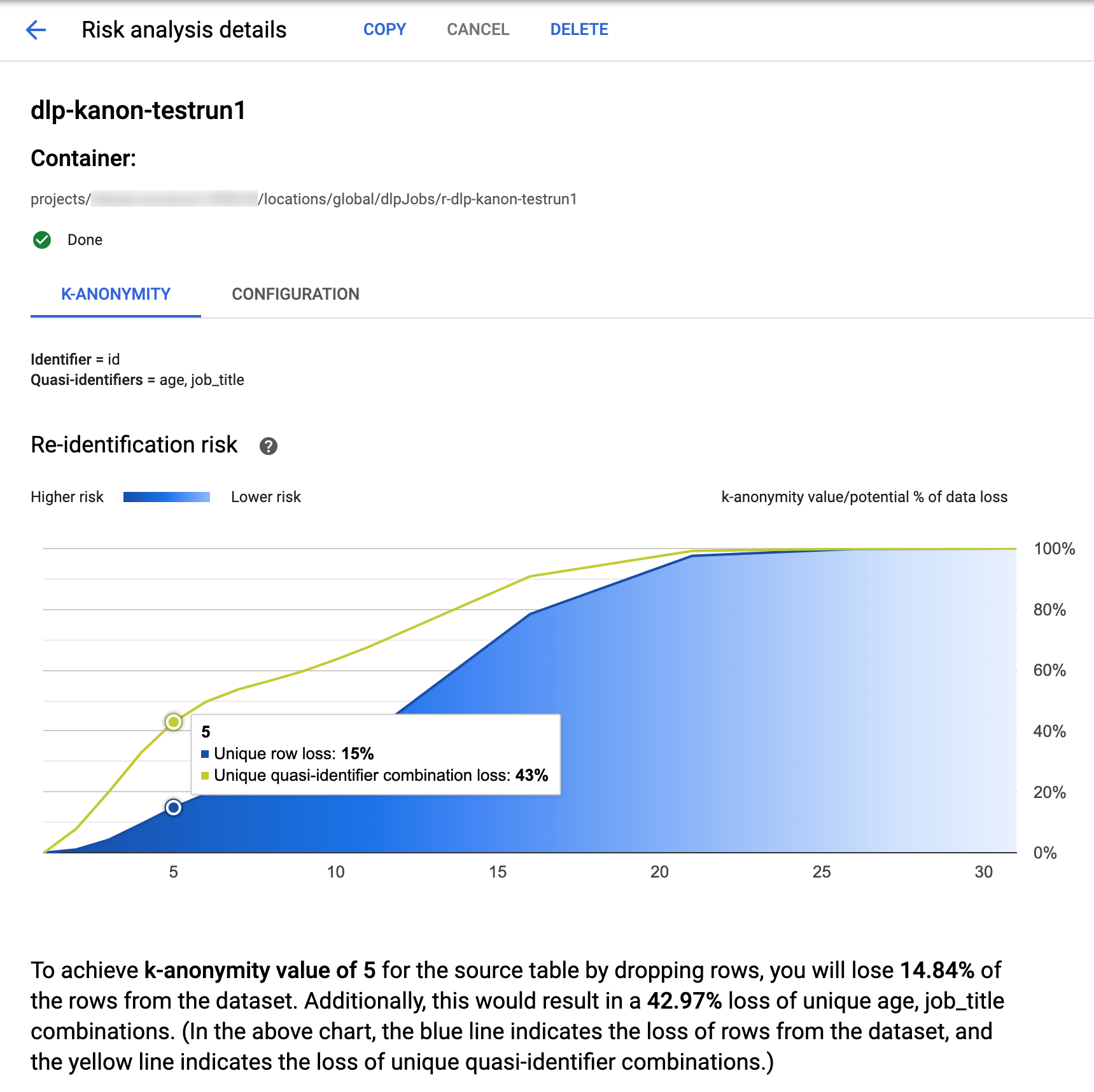 Oben auf der Seite finden Sie Informationen zum k-Anonymitäts-Risikojob, einschließlich seiner Job-ID und unter Container seine Ressourcenstandort.