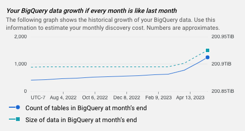 Setiap perkiraan mencakup grafik yang menunjukkan pertumbuhan historis data BigQuery Anda. Anda dapat menggunakan informasi ini untuk memperkirakan biaya pembuatan profil data bulanan.