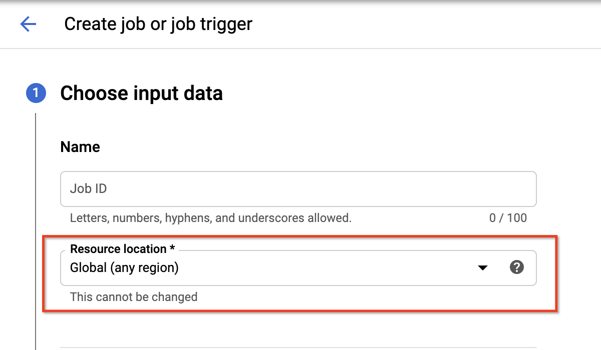 Cloud Storage や BigQuery などのストレージ リポジトリをスキャンする場合は、スキャンするリポジトリのロケーションと同じロケーションを機密データの保護リクエストで指定する必要があります。たとえば、BigQuery データセットが欧州連合のマルチリージョン ロケーションにある場合は、機密データの保護ジョブを構成するときに欧州連合のマルチリージョン(europe)を指定します。