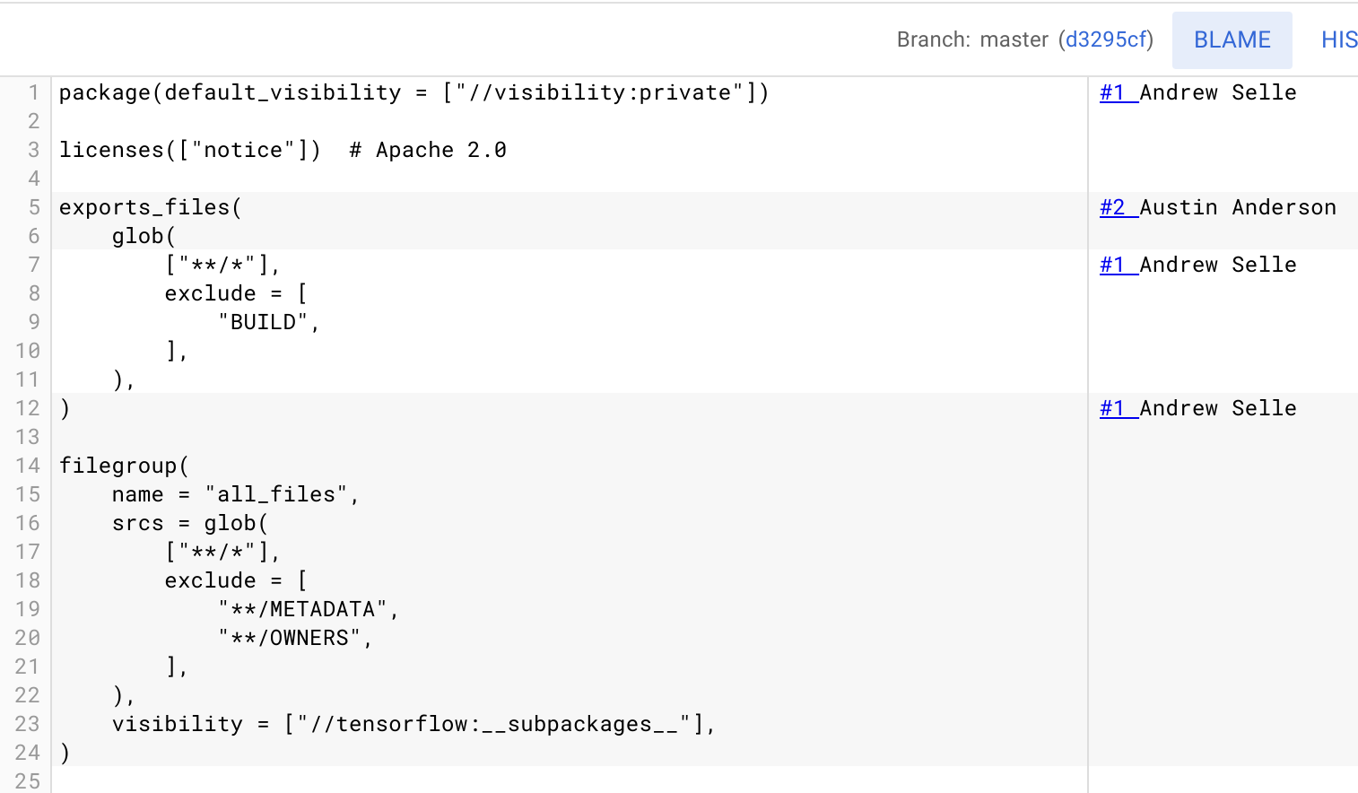 Cloud Source Repositories에서 파일을 보는 경우 Blame(원인) 또는 기록 옵션을 사용하여 파일 뷰 변경사항(예: 변경된 줄 및 변경 시점)을 자세히 확인할 수 있습니다.