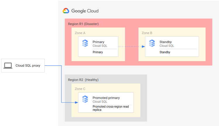 En Google Cloud, la recuperación tras desastres (DR) de bases de datos consiste en proporcionar continuidad del procesamiento, sobre todo cuando una región falla o deja de estar disponible. Cloud SQL es un servicio regional (cuando Cloud SQL está configurado para alta disponibilidad). Por lo tanto, si la región de Google Cloud que aloja una base de datos de Cloud SQL no está disponible, la base de datos de Cloud SQL tampoco lo estará.