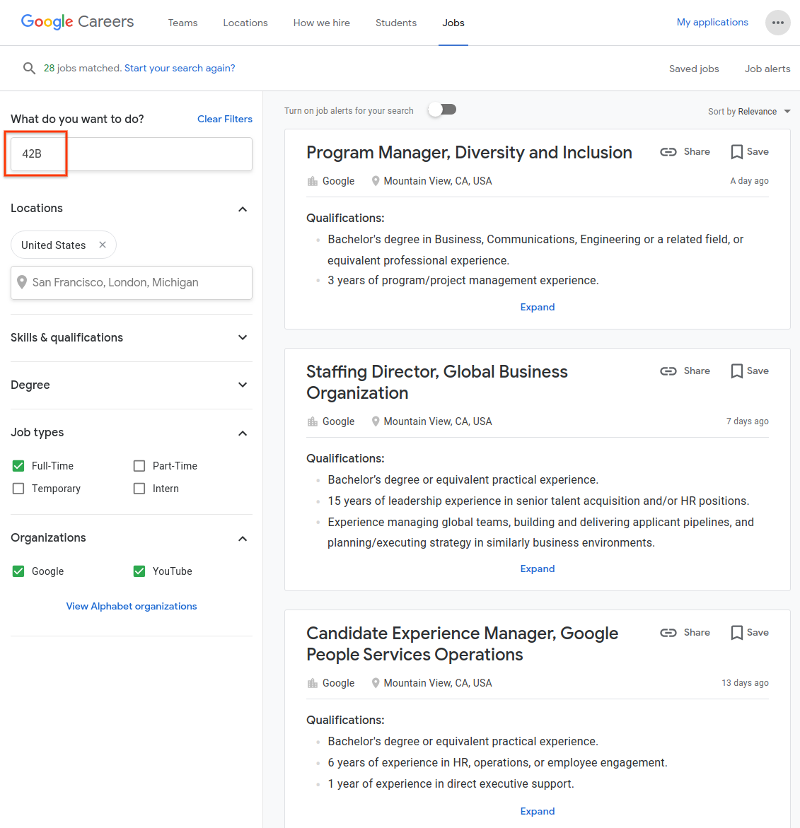 La recherche basée sur des codes militaires est proposée dans le cadre de l'algorithme de recherche Cloud Talent Solution. Tous les utilisateurs ont donc accès à cette fonctionnalité. Vous n'avez pas besoin d'intervenir au niveau du développement, et vous n'avez nullement besoin de modifier vos intitulés et descriptifs de postes existants.