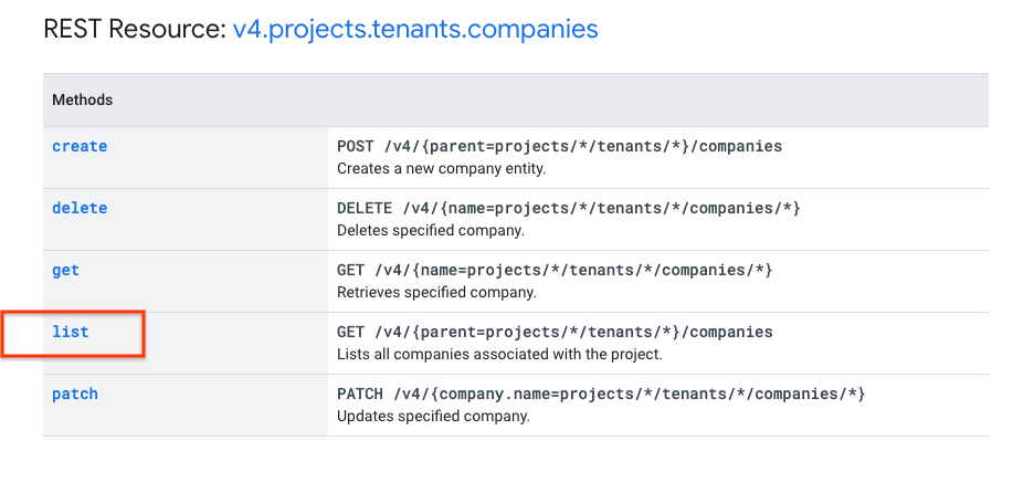 projects.tenants.companies.list 페이지로 리디렉션되고 메서드 API 탐색기 양식이 표시됩니다.